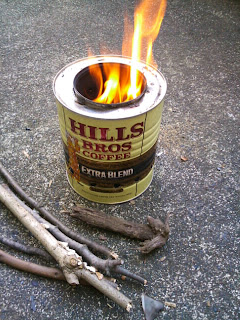 構造はシンプルです。私はコーヒーマメ徳用缶、29オンスに一回り口径の小さくおおよそ同じ高さの缶を一個ずつ用意しました。それぞれに側面と底に穴を開けてあります。小さい方の缶を大きい缶の中心にくるようにして、少し底を浮かしてあります。